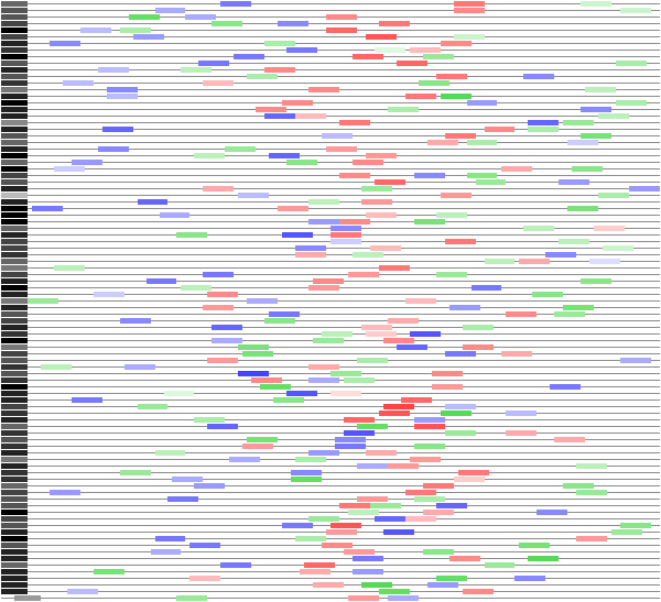 Different colors represent different profiles. Darker colors represent stronger matches to profile. G6834971@J907359_RC@j_at.-.chr1:24259259-24259409 gtatagtaatgttttccgcatgtgcattggtacagttcactgctagatgggcttcccctcacagtgctgtgagttaggaacaccagtagaattcatgttttgaatgatctccagggtaaaaaccaccacatgcattaagttattaaatct G6850160@J907675_RC@j_at.-.chr1:52778371-52778521 gtaaaaatttctgccaaacctttaatggtgatttgctatgctgtatggtgattttgctttcaaaacacaattttatcttttaaagaccagtgttatagtgtaactgagaaagagatttgtaaatattatttctttgaagaccagtgatgg G6817930@J907925_RC@j_at.-.chr1:72292747-72292897 gtgaatcttgaagtcttctgtgtttgagacatggatggtgttgcatgctgctcagtcgctgtggttaaatctggatgtttccaagccagtgattggctacggagatgaagacggggcccgctcagagataagggatacattagtctggtt G6865744@J908096@j_at.+.chr1:83630158-83630308 gtaactttggagactttgattaccaaagaacacgcagacttgatggagcttgtattgtgcaggacatcatgatgcatgtcatagccgtgattatatttatgtatacgacttaggcctctgtagctttcccttagaagaaatgatgtgctt G6845409@J908514_RC@j_at.-.chr1:120494383-120494533 gtaagtttaagcagttacctttcatttcttgtagtttttctttgtgtccattatataaagcccttttttatttaatgagttttagtattttttaattagattcaattttttttttttttttgcctgttaaactttctttgggattttagg G6819323@J908687@j_at.+.chr1:137044783-137044933 gtatgagcctgttttactcttaaccttcttacttcacgccctgcctggccctacagatcaccctccccgaccctcttgctagcatgagcagtgggccagaaccctaaggtggcagagaacagggggaggcattcaggcctggacacaaca G6820698@J908972@j_at.+.chr1:165102325-165102475 gtaggtgcctgacttccctttccccaggaatgtcccctgtggcccggaacctgggtgtgccgaggcttcgtgtggctgccatttccctgcactatgctgcatgtccagcgtcacccgtgcttctcagattttgtttcccccgaatcatcg G6820594@J909190_RC@j_at.-.chr1:169393316-169393466 gtagggacccagccaatatgccaccaggtggattcagtagagtgtaccagccttcagttttctcagcgtcctgctcctgtctggacagaaagaaggagaaagaaagggagggaaaggcagacaggcagtagtcaaatcaaatcagagtaa G6813886@J909757@j_at.+.chr10:17982776-17982926 gtaagtcaatcacttagcttgcttgtttgaaattaattttattaacccaatatccatcattatggtttttactgatatgcatgattcagtgtagtgcttagagggaaagttggcaggcctttggggttttttgggttttgtgggtttttg G6829755@J909798@j_at.+.chr10:20217634-20217784 gtgggtgttagaaatctgtttcatttgatttgtgttgatttccaaacatcctaggggaatacatttcattcagaacagatggtcaccactatgagattttcattgtaacttgggcgaacattttttttttactatcattacttaaattgt G6836374@J910003@j_at.+.chr10:42610848-42610998 gtaagacttatttacagtggagctatgcttttctgacttaccatgtaactttaaagcaaaatgtgccagttctaacttaagagctccagaatgtgggtgaaagccggtgcaggacttatgtgaagggtccatctcaggctgtacctgagt G6868962@J910360@j_at.+.chr10:70033692-70033842 gtaatatgaaaacttctgctcttattctatccaaggtagactagatatcggatatgcgtggaaaagcttgcagcgggctcaggtgtgggaacagcctaaatgatcttgtgcctcttagccgatcctgaggtagagttagctttctttaac G6860927@J912087@j_at.+.chr11:29704923-29705073 gcaagttctttctgccagcctttcttctgtattctaactcactctaatgttaactcaacagagtactttgcatttactagaaatcaatgttgggccaagaatgttgtttttacaagagagacatggtcaggatttgattcataattgtaa G6891129@J912265@j_at.+.chr11:49591629-49591779 gtattgaaatcttattaatgtcccccatcataattccagtaattaaaatggtactggaagggctggagagatgacttagcagttaagagcatttgatgctcttgcagaggacctgggtccagttcccaacaccctatgatcacacccaac G6899511@J912281@j_at.+.chr11:50554472-50554622 gtaaggcccatgtcccaccgacaaccaacccagctccctttgtgaagtgctagcggccacacacagttgttgctccatatctgtgggatacaatgaattccatggattcaaccaactgtgtgtcgaaaatatttggggaaaaggattgta G6903939@J912580_RC@j_at.-.chr11:55237111-55237261 gtaagtctgtccactgatggctagatatggaaatgatgtccacaaaaccagtctactctgtgttctgagcactcaccagcagtcagttcattttgttggtgttctcccttccagtattactgtgtggctttagagtgtggctttgatctt G6909490@J912863_RC@j_at.-.chr11:66343987-66344137 gtaagctaaaattttgatattctgttacttttttctcatatccatcttggtattgggaatgtgtccactgttgtttcaactaacagaccatggggattttgcactgaaagagcttccatttttcattctgttccttcccacccttagtta G6937358@J912962@j_at.+.chr11:71196750-71196900 gttagtgaggggctgctgggaagccctctgttccctgcctgcacctccgctggcaggcacccttcctcggtgttgcttctgcccaagccctactgcctcccctcatctcctcttctctgcaggactttgtgttgctcaaagagcggactc G6926528@J913333@j_at.+.chr11:78136170-78136320 gtacccacacctgttggctgcaggctgtgacgtttgggtgggggaggcttggtgtgtgacctcggggtctcatctccctgagccccctgcatgcttgggaggcaaccagcaggggccaggccatccctcatgtctggcctctctcctccc G6928027@J915031_RC@j_at.-.chr11:117189310-117189460 gtaagcggtgcgactccccagccccatcctcccctccaaaacccggtgggtgaggttcccaggggaccagccctcaggacccactggggcggggcagaggggcagagggactgagttccttaaggatgccctcacctcccctggctccct G6876366@J915273@j_at.+.chr12:3106283-3106433 gtcagagtgggggtgatgggaagtaatgtcatgggctcaggaagtgatgtgctgctgctctacatgtgtacgtatatgcctggtctgtgatgctgcagaatatgtgtacatgtgtgctgggtgtgggatgtacatgtatgcctcatgttt G6910999@J915678@j_at.+.chr12:65574558-65574708 gtattttttttaaaacaaacagaaaactatggactggcatggtggctcagtatggaaaggtgcttgttgaacaagcctggcagttgaggtttacgctcggaacccacataaaggtagaaagagagaaccacttccacagagttgtcatcc G6875109@J916256_RC@j_at.-.chr12:94625320-94625470 gtaggtatctgctttccctgtagcttccccacggctttgcatgggaggcccctagacgcctgtcccctccctctaggagtccagtagtgctttgaccgacaggagggacacaagccgccctccgacacagtgaacactggagctagctgc G6909211@J916434@j_at.+.chr12:107324695-107324845 gtaagtgggatacctggatagtgaggatttgagaaagtcagtgctttggatagtaaactctccttcccatggtgcccagggtgatgggcacactttgttcaataccctggagatggtggactcatttcctcccaagtgccctgagtgaca G6885622@J917196_RC@j_at.-.chr13:55051849-55051999 gtactttacataatttatttccttctgtcctcacaactctgtgaagtatggtgttattcccatttcataaattgagaaacctgagactcagaatttgagtaatactcaaaatactgaaatggcagaagagggatttgaacttagaacaat G6946480@J918038_RC@j_at.-.chr14:14227359-14227509 gtaagtacttcggtttcatttatttgtatattttgtaaaaggtacatttgattaaagagcaaaaacagtgtggtggcttggactcaaggaagtggagaccggggttgtaattggctgttcacagaaactgcatgtagtgagcatgactgt G6963012@J918087_RC@j_at.-.chr14:15858854-15859004 gtgagccttgcctgcccacccaccctccacttcatgctgcttgtgcccgcctgccagccatgcagacccattctgccatgtgcgtgtgcgtcactcatcctcactgcatgtctgtgctgtgtgggcaggtgtggcctgtcctgccaggcg G6933241@J918246@j_at.+.chr14:26357537-26357687 gtgggtgacccctctactgcccaaggacagctgctctgagaagatgggctgggatgccctcatgtgccttctttttcacagattgatgaccagcgaaggacccacaactatgacgagtttatctgtaccttcatatccatgctggctcag G6924354@J919294_RC@j_at.-.chr14:94383209-94383359 gtgagttaactgtaaggaacaataagcatgttccaggtgtctcagcatgtgcaacaggattgacattgtatttgaggctttgcttagagttaagaaactgaaaagttactgggggaaaactctgtgcaaagtgctgcagttgcgtttccc G6972175@J919743@j_at.+.chr15:42031075-42031225 gtgcccccttctgtagtttaaactcctttggagattaaat