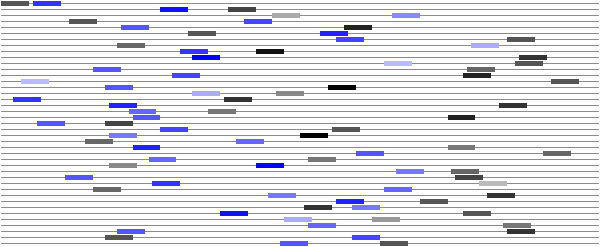 Improbizer will display the results in parts. First it will display the profiles (consensus sequences with the probability of each base at each position) individually as they are calculated. The position of a profile in a sequence is indicated by upper case. The strength of the profile match is indicated by the score on the left. There will be a delay during this phase as each profile is calculated. Second Improbizer will display all profiles at once over each sequence. Each profile has it's own color and the stronger the profile matches the darker it will appear in the sequence. Finally there will be a graphic summary of all the profiles at the end, using the same color conventions.