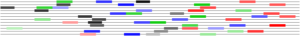 Improbizer will display the results in parts. First it will display the profiles (consensus sequences with the probability of each base at each position) individually as they are calculated. The position of a profile in a sequence is indicated by upper case. The strength of the profile match is indicated by the score on the left. There will be a delay during this phase as each profile is calculated. Second Improbizer will display all profiles at once over each sequence. Each profile has it's own color and the stronger the profile matches the darker it will appear in the sequence. Finally there will be a graphic summary of all the profiles at the end, using the same color conventions.